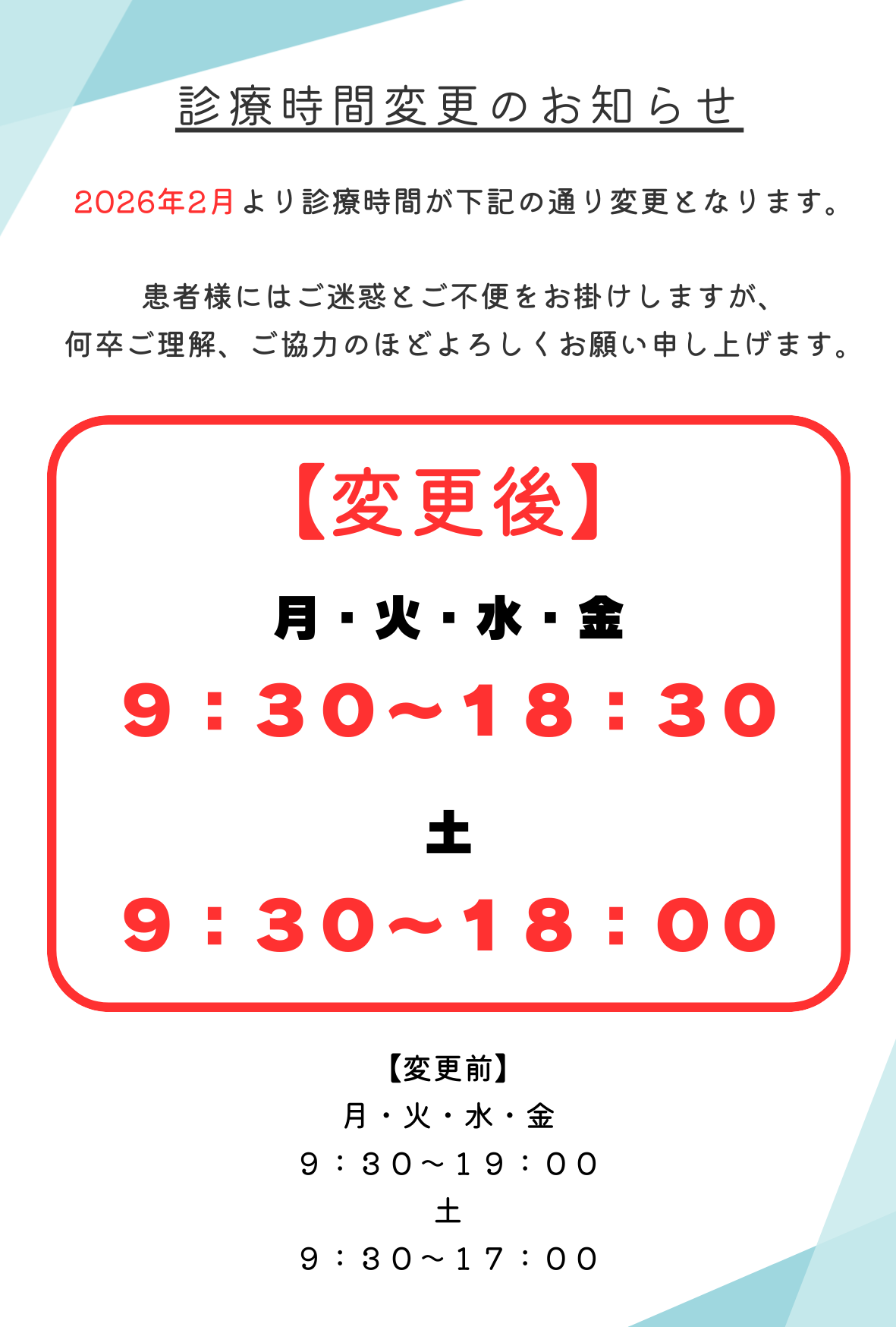 【診療時間変更のお知らせ】