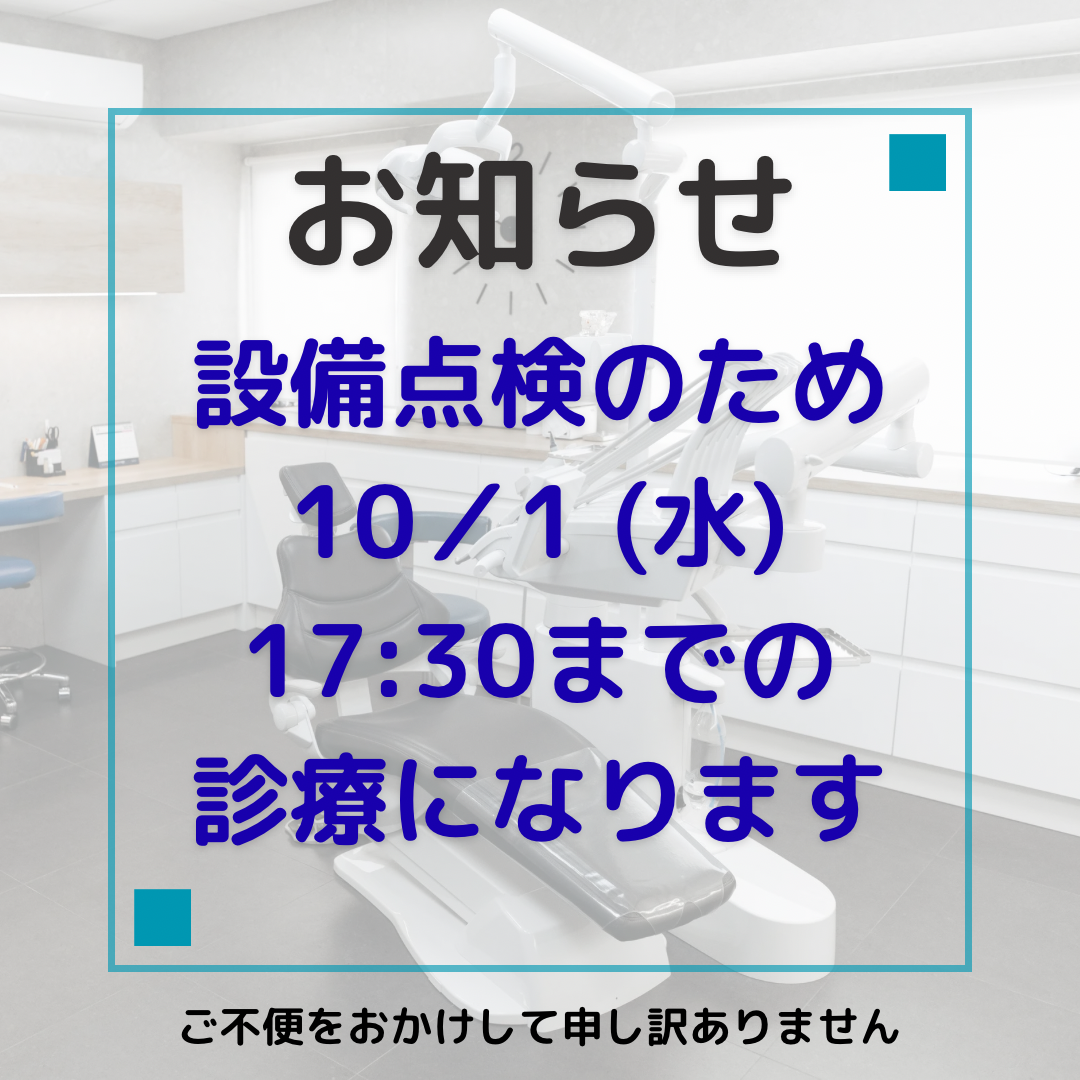 上記の日にち設備点検のため、休診とさせていただきます。 ご迷惑おかけして大変申し訳ございませんが、ご理解のほど何卒よろしくお願い申し上げます。